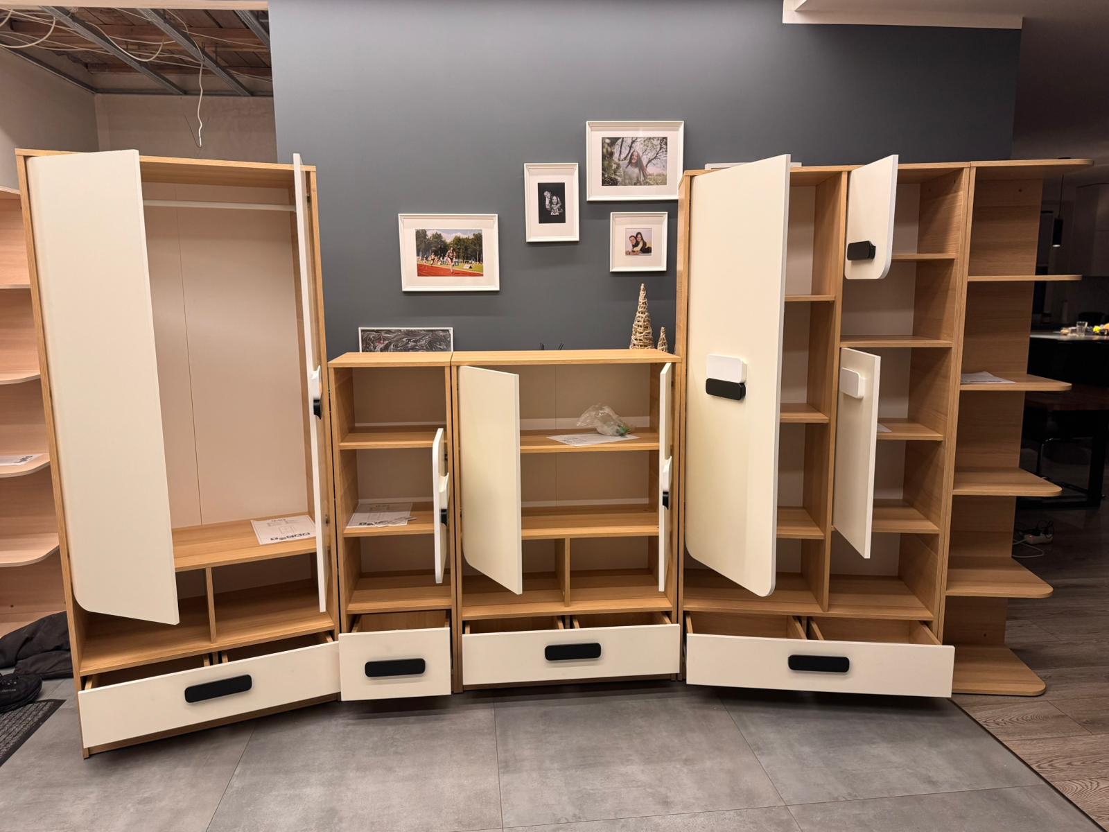 Mūsdienīgs un funkcionāls mēbeļu komplekts ar pārdomātu uzglabāšanas risinājumu. Apvieno slēgtus skapīšus, atvilktnes un atvērtus plauktus, nodrošinot ērtu vietu gan ikdienas lietām, gan dekoram. Dabīga koka toņa korpuss harmoniski saskan ar gaišām fasādēm, piešķirot mēbelei tīru un modernu izskatu. Piemērota viesistabai, guļamistabai vai priekšnamam. Stabilā konstrukcija un praktiskais dizains padara šo kumodi par uzticamu izvēli ikdienas lietošanai.