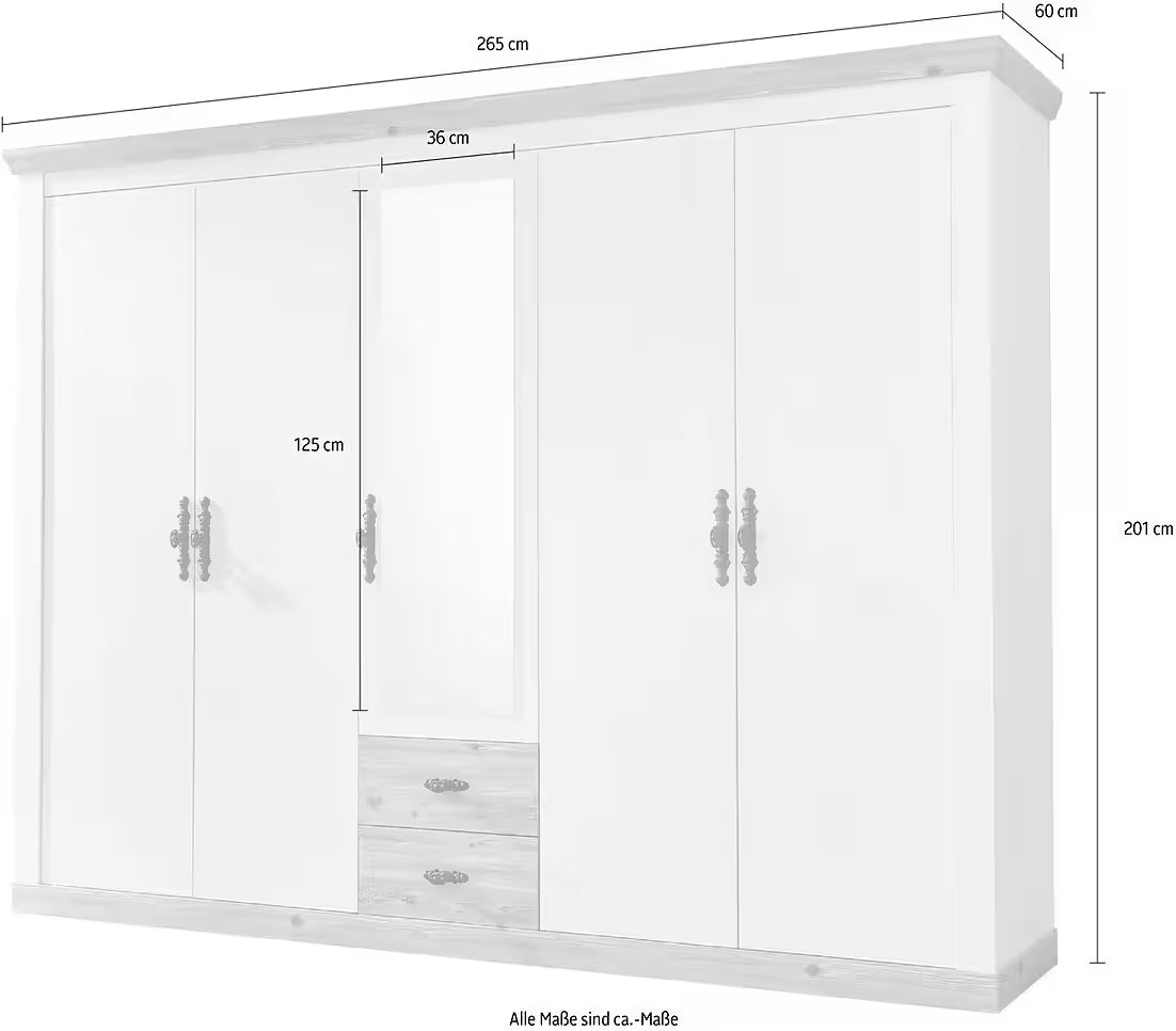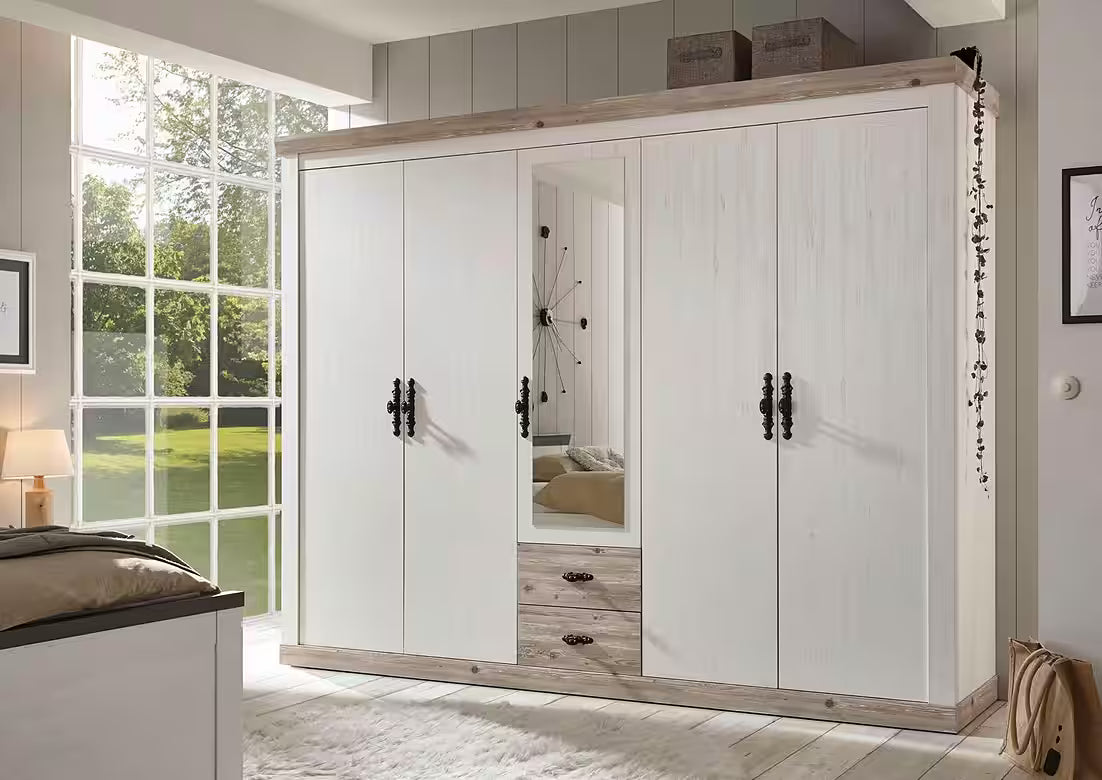 Ietilpīgs četrdurvju skapis baltā un dabīgā koka toņu kombinācijā, kas atbilst dažādiem interjera stiliem. Aprīkots ar centrālo spoguļu, vairākām plauktu zonām, drēbju stangu un divām atvilktnēm apakšdaļā, tas nodrošina plašas un pārskatāmas uzglabāšanas iespējas.