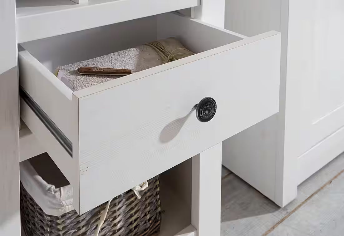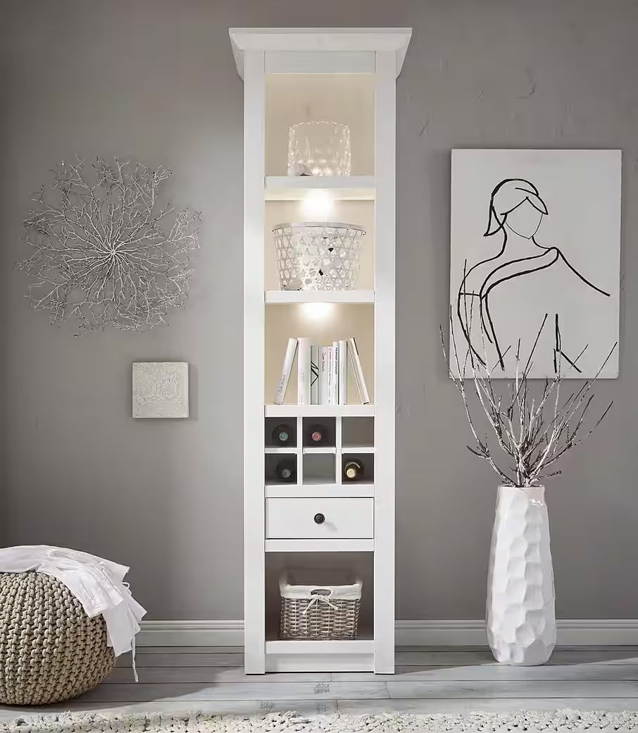 Balta šaura vitrīna ar integrētu pudeli LED apgaismojumu, kas apvienots plauktus dekoru izvietošanai, vīnam paredzētu nodalījumu, praktisku atvilktni un apakšējo slēgto plauktu. Ideāla izvēle viesistabai vai ēdamistabai, lai apvienotu eleganci ar funkcionalitāti.