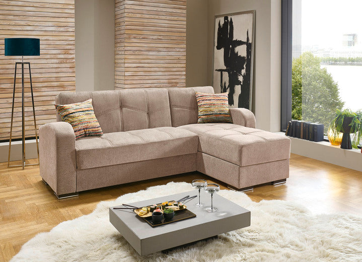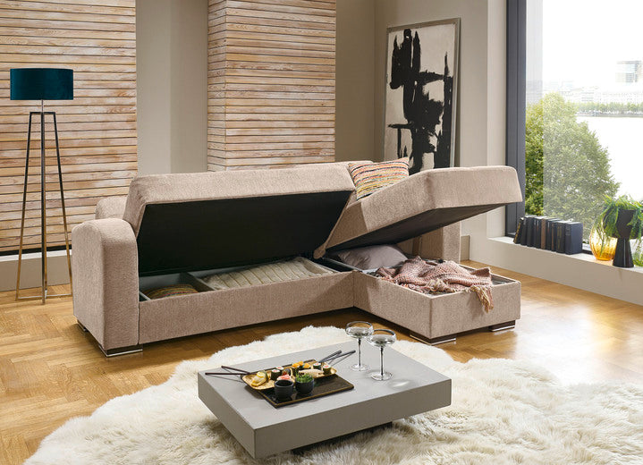 Stūra dīvāns ar guļamfunkciju un veļas kasti, krēmkrāsā