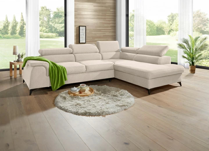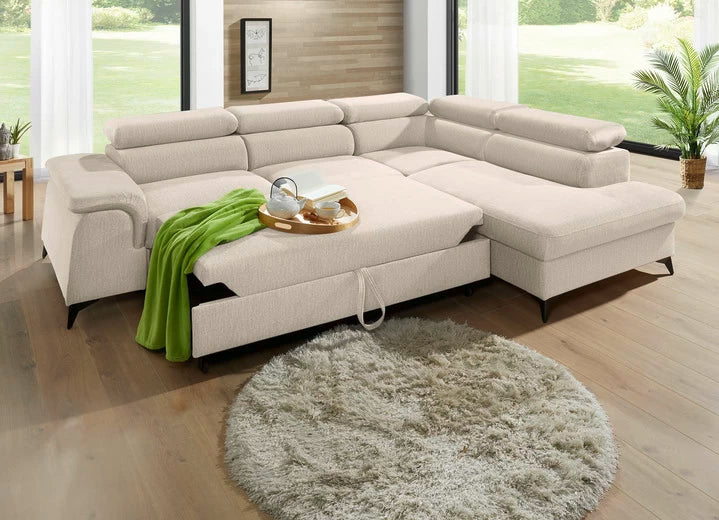 Plašs un elegants stūra dīvāns ar guļamfunkciju un ietilpīgu veļas kasti. Pateicoties vienkāršam mehānismam, to var viegli pārvērst par ērtu guļamvietu. Regulējamie galvas balsti nodrošina papildu komfortu sēžot vai atpūšoties.